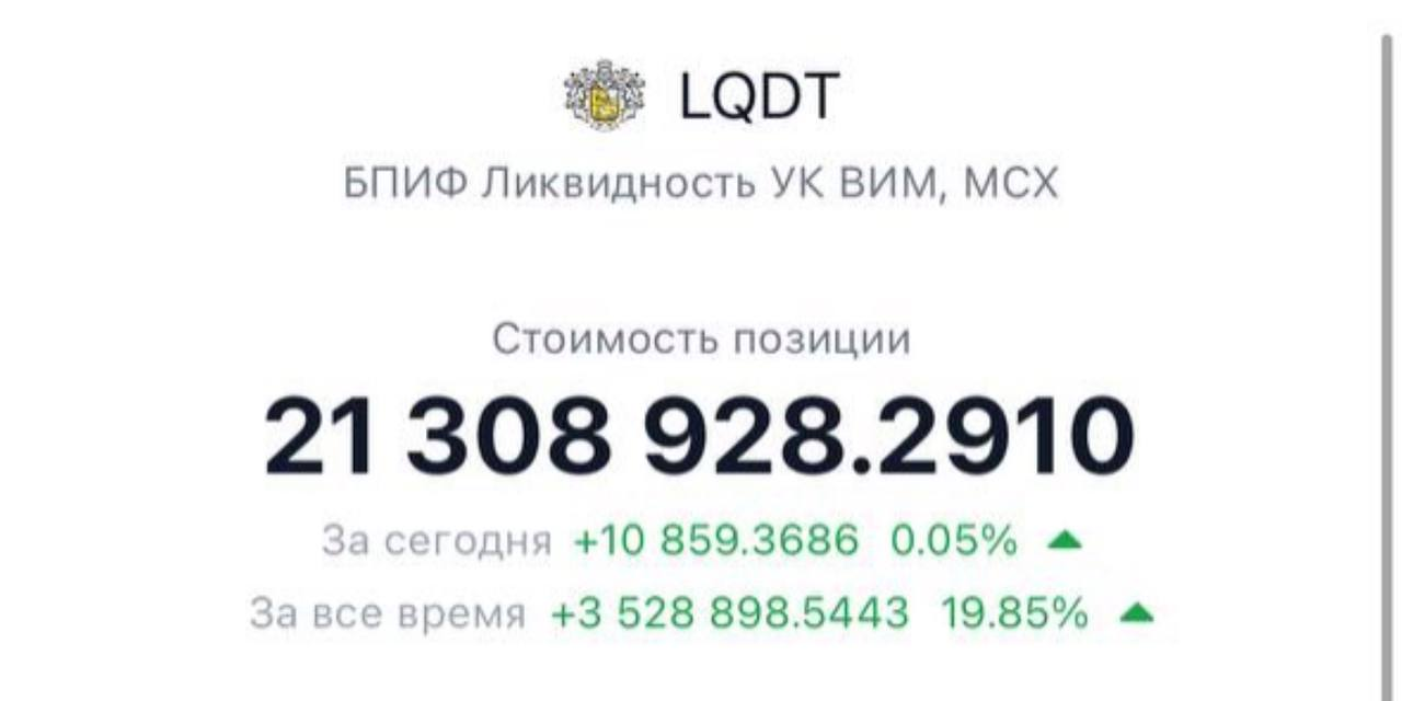Летом 2025 года я получила +3 500 000 рублей с помощью фонда денежного рынка LQDT. Вот скрин одного из моих брокерских счётов с этим фондом. Я покупаю LQDT не только на нём.