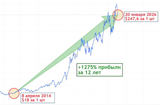 Если бы вы купили 1 акцию в 2014 году за $18, то сейчас у вас в портфеле было бы $247,6. Это в 13 раз больше!!!