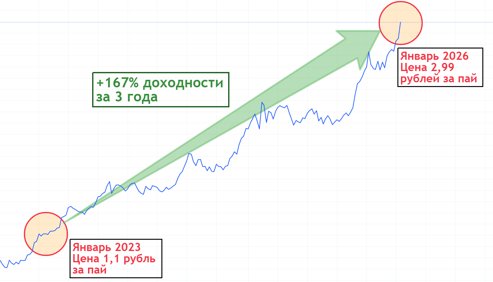 Давайте посчитаем, если бы вы купили паёв фонда «ВИМ Золото» ($GOLD) на 50 000 рублей в 2023 году. То в 2026-м они превратились бы в 133 500 рублей.