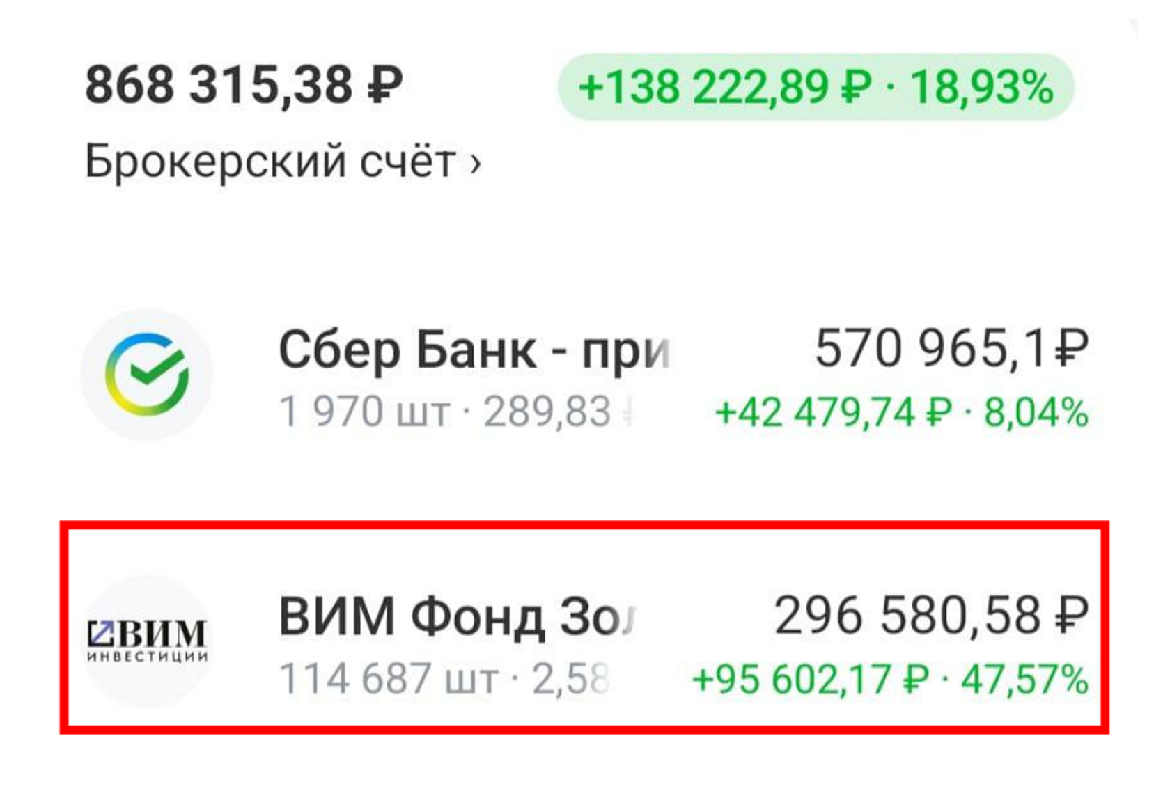 Именно столько стоят паи фонда «ВИМ Золото» ($GOLD). Он вкладывается в физические золотые слитки, которые хранятся в России, поэтому стоимость его паёв привязана к цене на золото.