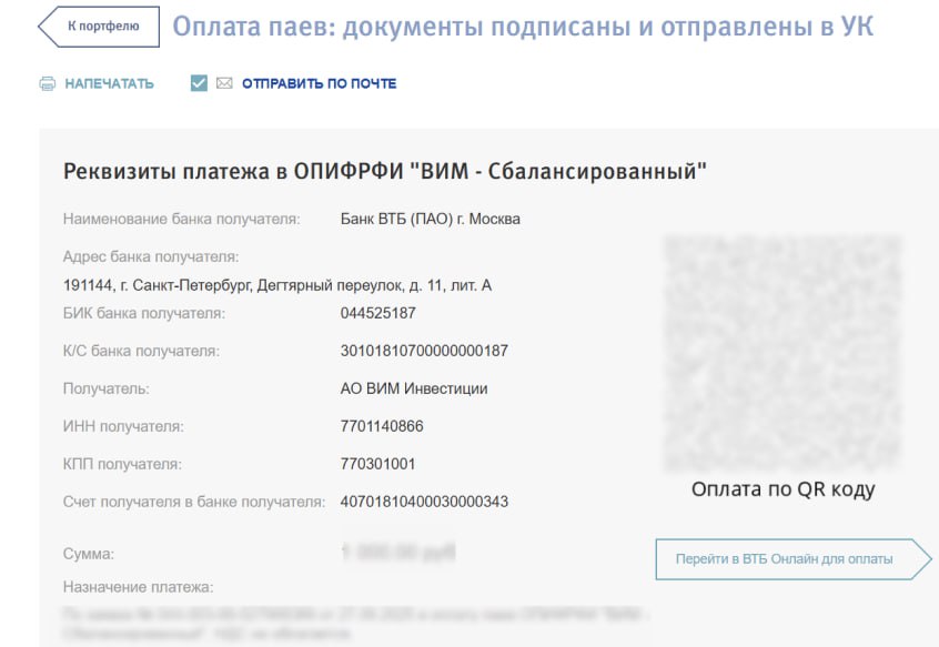 2️⃣ Оплатить покупку ПИФа по квитанции. Она автоматически формируется в личном кабинете. И можно оплатить по QR-коду.
